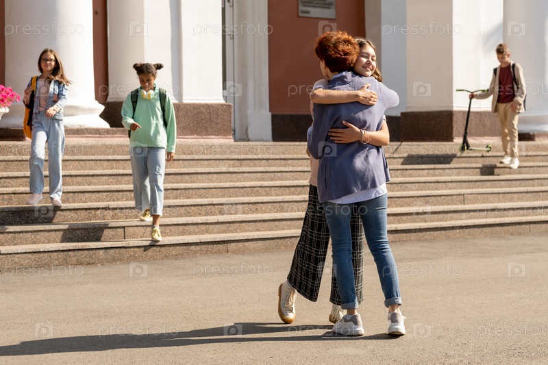Счастливая и любящая мама с дочерью обнимаются рядом со школьным зданием