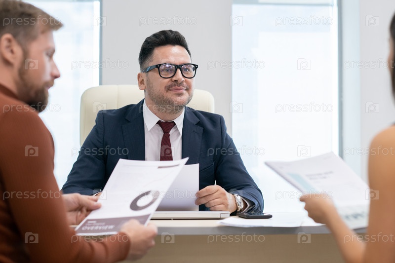 Серьезный адвокат или аудитор слушает молодую женщину во время консультации