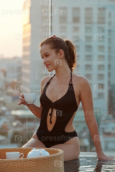 Молодая женщина пьет в бассейне