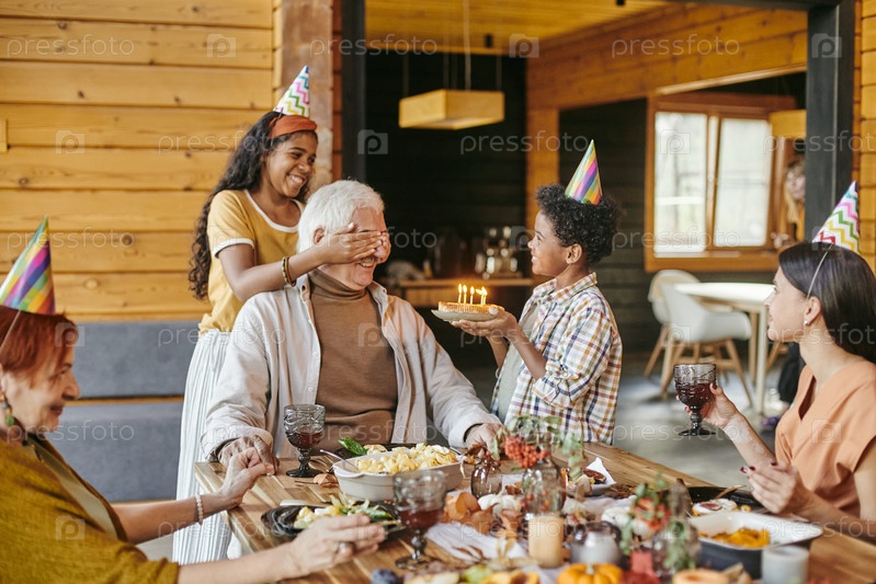 Счастливая милая девочка закрывает глаза дедушке, в то время как ее брат держит день рождения пирог
