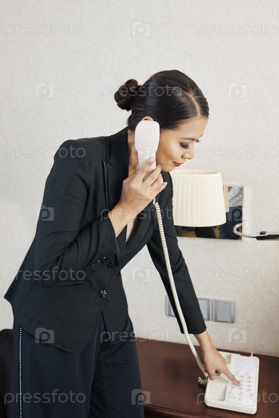 Женщина, совершающая телефонный звонок из гостиничного номера