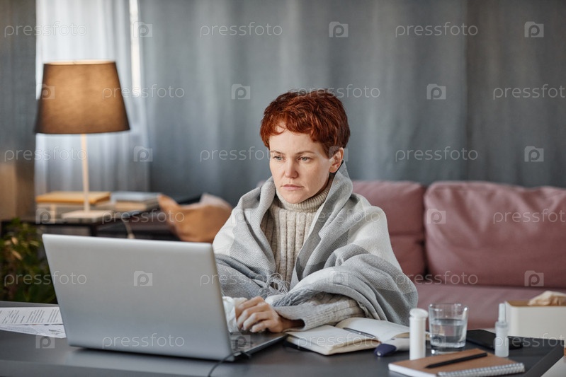 Портрет зрелой женщины с гриппом, одетой в тёплую одежду, сидящей за столом в гостиной дома и работающей на ноутбуке