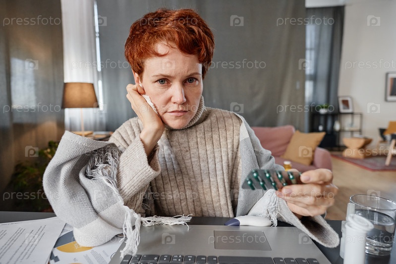 Горизонтальный снимок современной зрелой женщины, сидящей за столом перед ноутбуком и рассказывающей врачу о лекарствах, которые она принимает во время онлайн-консультации