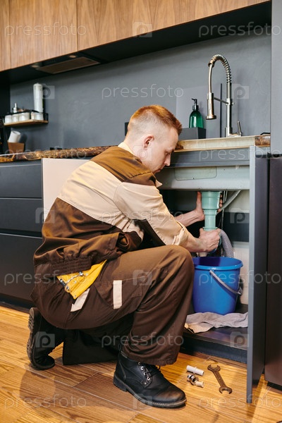Современный сантехник в рабочей одежде меняет трубу под раковиной