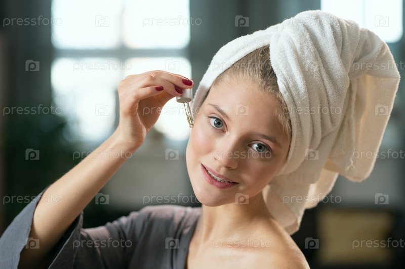 Молодая женщина в шелковой серой пижаме наносит косметический продукт на шею и тело