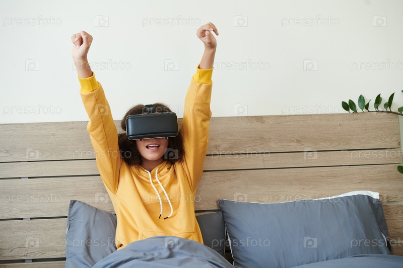 Игральная девушка поднимает руки во время просмотра матча в D