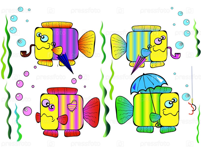 Разноцветные рыбы с зонтиком на белом фоне