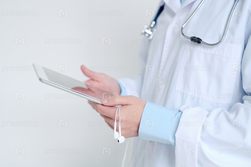 Руки молодого врача-мужчины в белом халате, держащего наушники и цифровой планшет