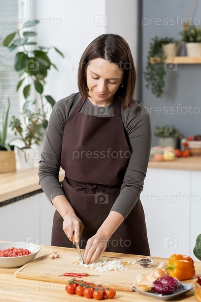 Молодая красивая самка режет лук на деревянной доске