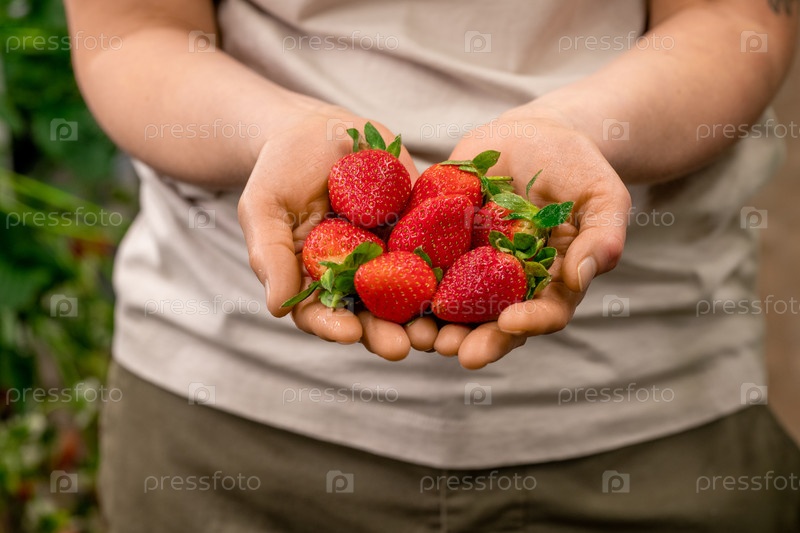 Фермерка держит кучу клубники