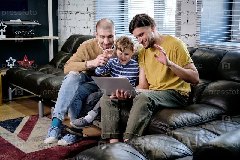 Два молодых человека и маленький мальчик общаются через видеочат