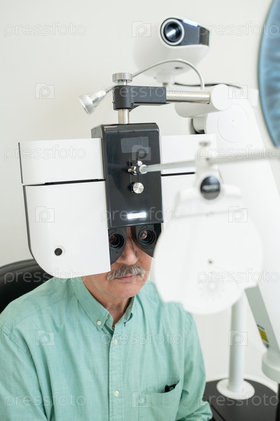 Пожилой пациент сидит перед офтальмологическим диагностическим оборудованием