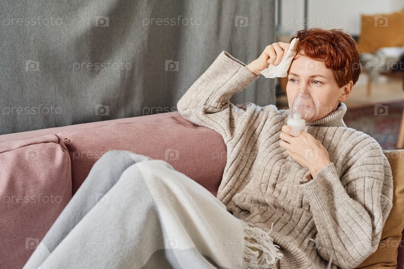 Горизонтальный средний снимок зрелой женщины с короткими рыжими волосами, страдающей гриппом, лихорадкой и кашлем, расслабляющейся дома с помощью небулайзера