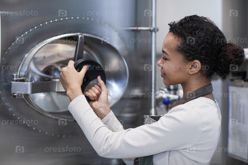Улыбающаяся молодая женщина открывает хранилище на фабрике
