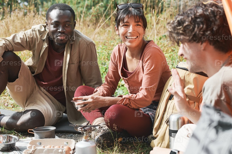 Группа взволнованных молодых мультиэтнических друзей сидит на траве и ест, отдыхая во время прогулки по лесу