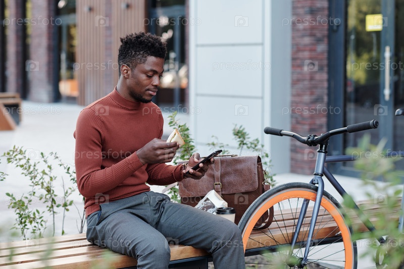 Серьезный африканский рабочий с белыми воротничками, ест бутерброд