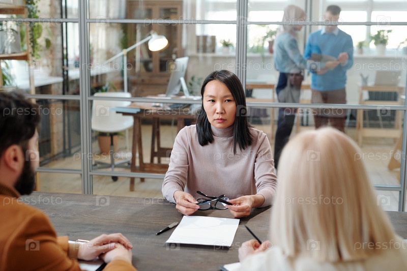 Серьезный азиатский кандидат слушает вопрос рекрутингового персонала