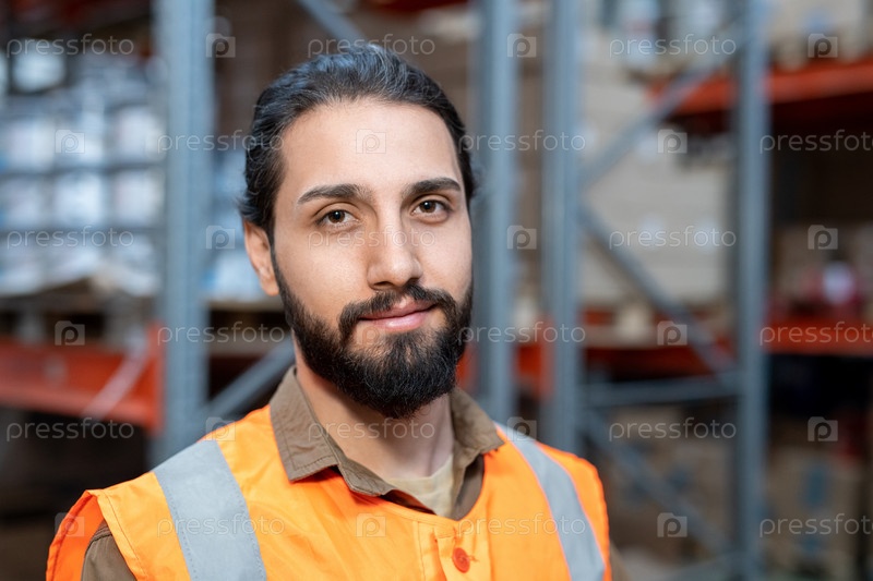 Улыбающийся работник смешанной расы на складе