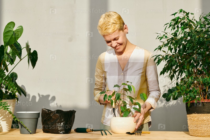 Улыбающаяся блондинка смотрит на зеленое растение в цветочном горшке