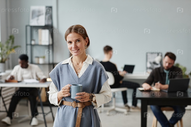Молодая бизнесвуменка стоит в офисе