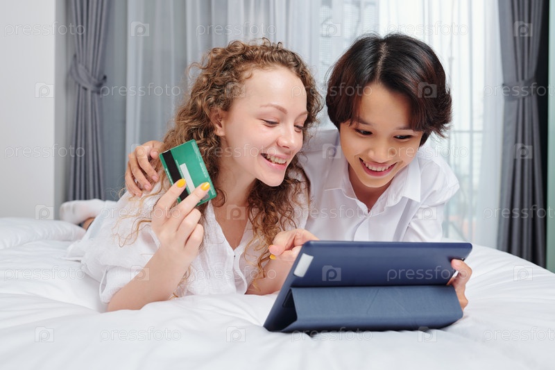 подруги, совершающие онлайн-покупки