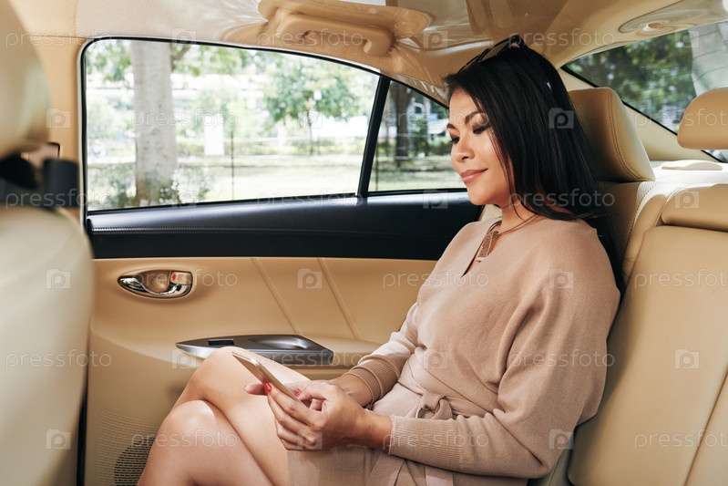 Женщина читает бизнес-чат в машине азиатский