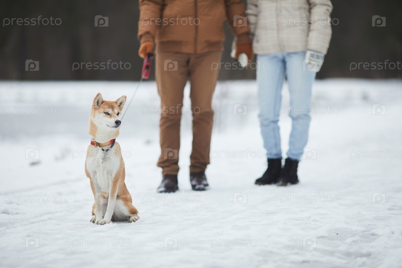 Милая собака Шиба наслаждается прогулкой в зимнем парке