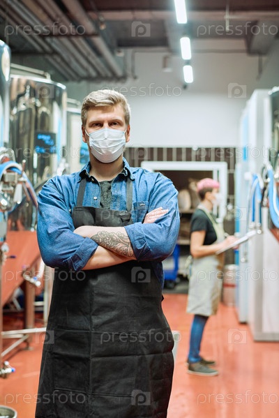Работник-мужчина в защитной маске стоит напротив коллеги, переписывающей данные с панели управления