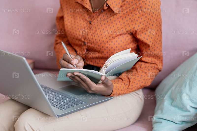 Руки молодой чернокожей женщины, делающей заметки в копийке