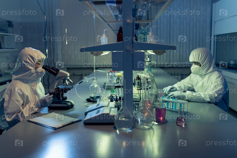 Два современных работника лаборатории в комбинезонах
