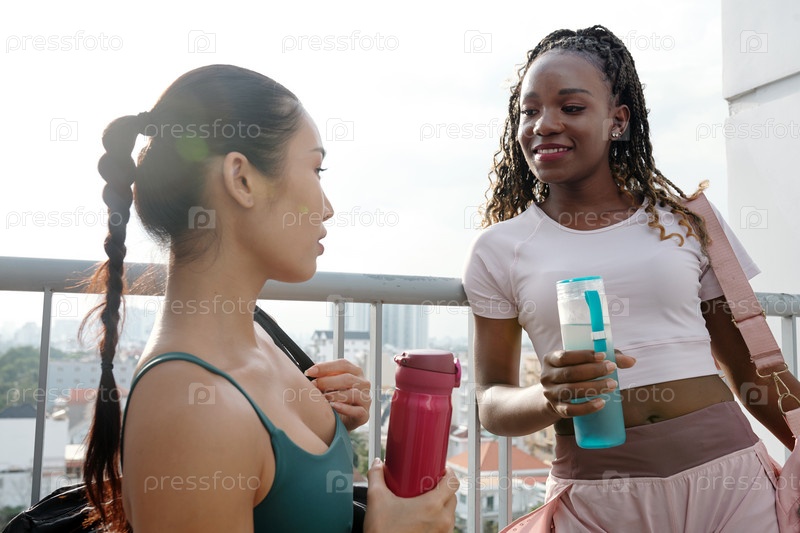 Улыбающиеся спортсменки, обсуждающие тренировку