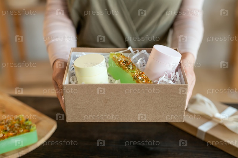 Руки молодой женщины упаковывают палочки свежего натурального мыла ручной работы в коробку для подарков