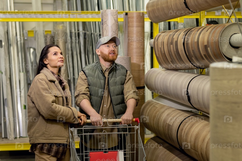 Молодая пара выбирает линолеум для своего дома