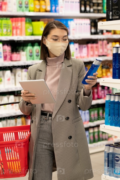 Потребитель с корзиной и планшетом стоит у большой полки с продуктами по уходу за волосами