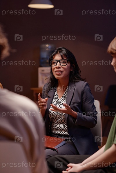 Вертикальный снимок современного психотерапевта, работающего с группой людей, страдающих депрессией и обсуждающей что-то с ними