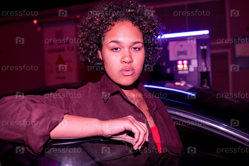 Красивая женщина смешанной расы смотрит на тебя, когда выходишь из машины