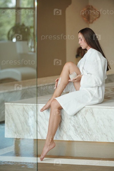 Молодая красивая женщина наносит смягчающий крем на кожу ног