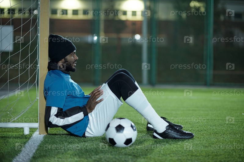 Молодой африканский футболист сидит у сетки на зеленом газоне