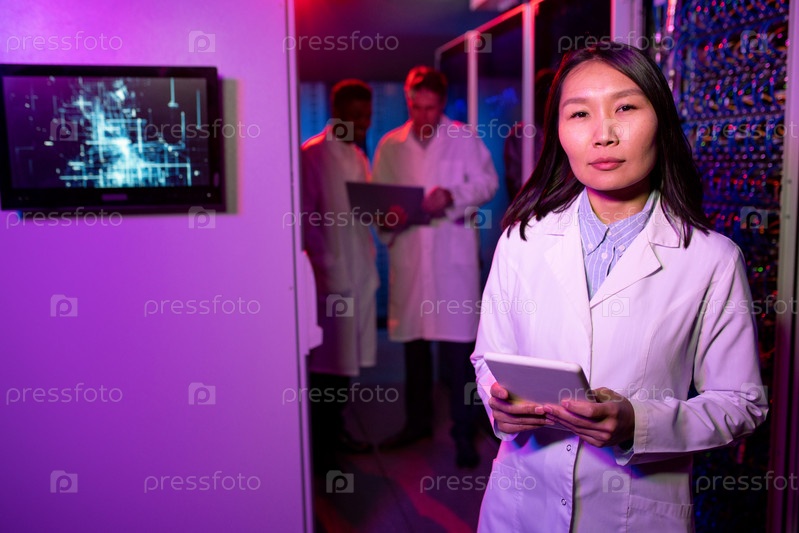 Современная азиатская женщина в лабораторном пальто работает в серверной комнате