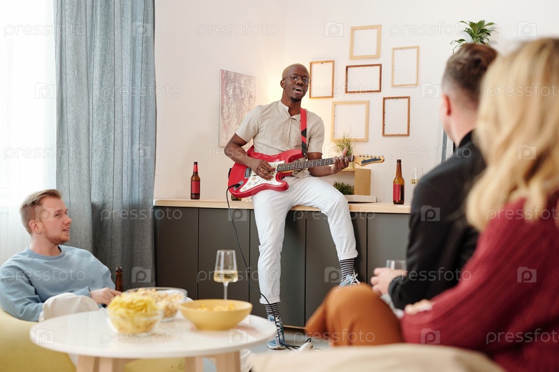 Молодые межкультурные друзья слушают пение африканского парня, играющего на гитаре