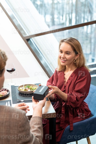 Красивая блондинка проходит мимо маленькой темно-голубой коробки с подарком для своего парня