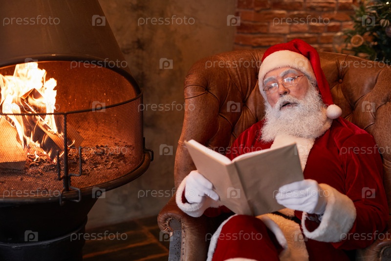 Отдыхающий с книгой у камина Санта