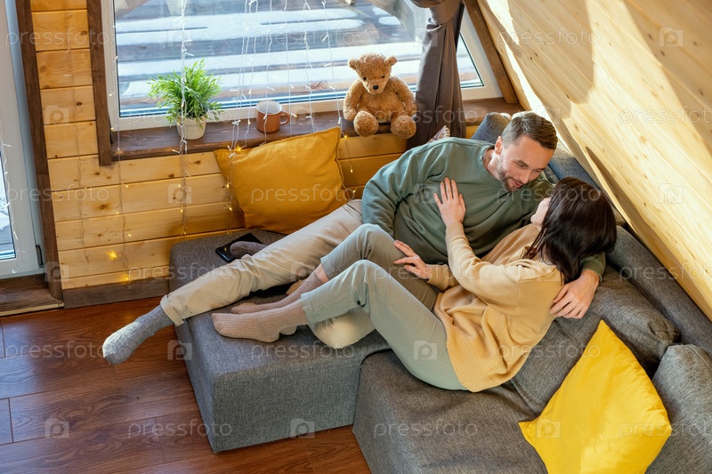Счастливый молодой расслабленный муж и жена в повседневной одежде отдыхают на большом диване