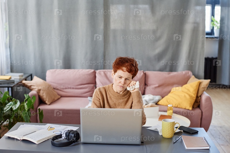 Горизонтальный снимок зрелой женщины, страдающей гриппом, сидящей дома за столом и работающей на ноутбуке