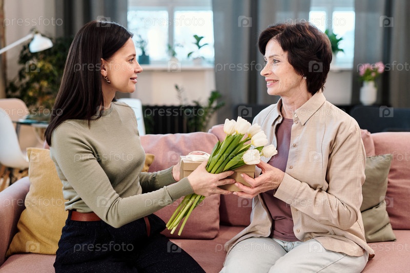 Счастливая молодая женщина передает маме букет тюльпанов и коробку с подарками