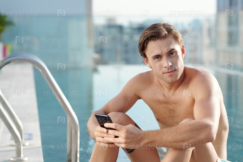 Человек со смартфоном сидит у бассейна
