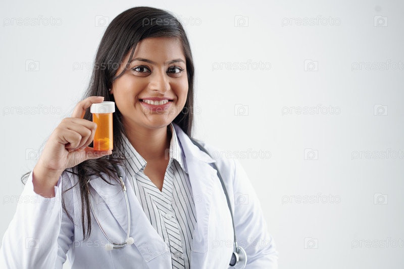 Веселый врач показывает таблетки
