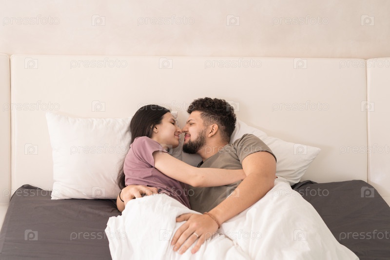 Счастливая молодая любящая пара в футболках, лежащие обнимаясь под белым одеялом на большой двуспальной кровати