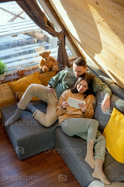 Счастливый молодой расслабленный муж и жена в повседневной одежде смотрят онлайн-фильм
