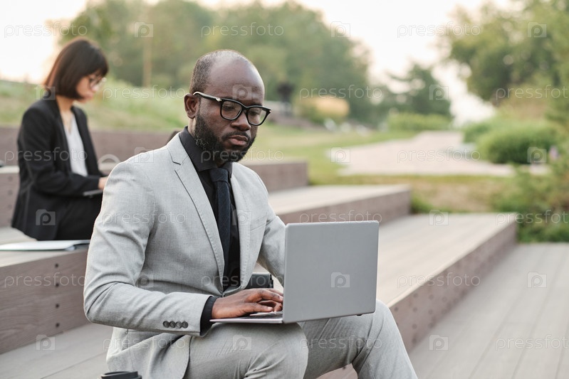 Черный бизнесмен, работающий в парке